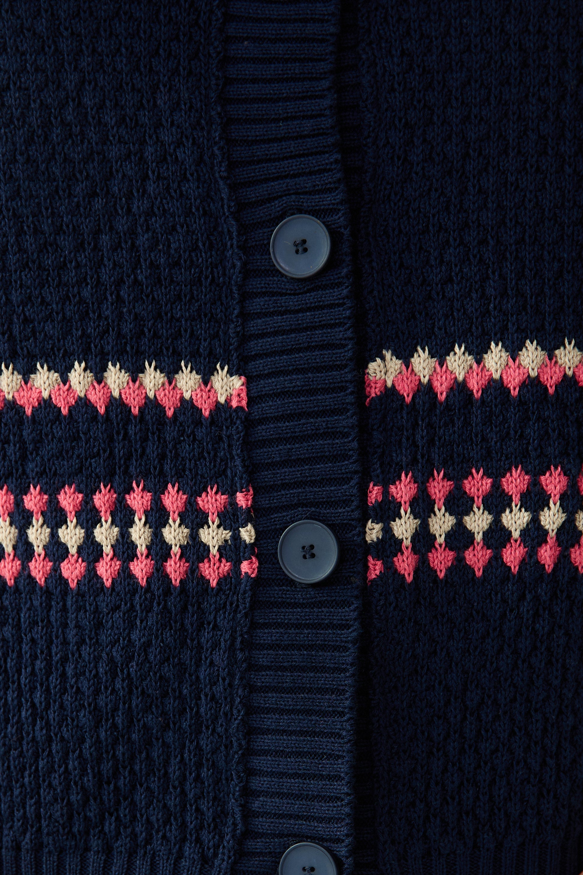 Càrdigan de botons amb coll rodó. Punt de "bombolles" amb relleu. Molt amorós. De fons blau marí i bombolles de color fúcsia i arena.