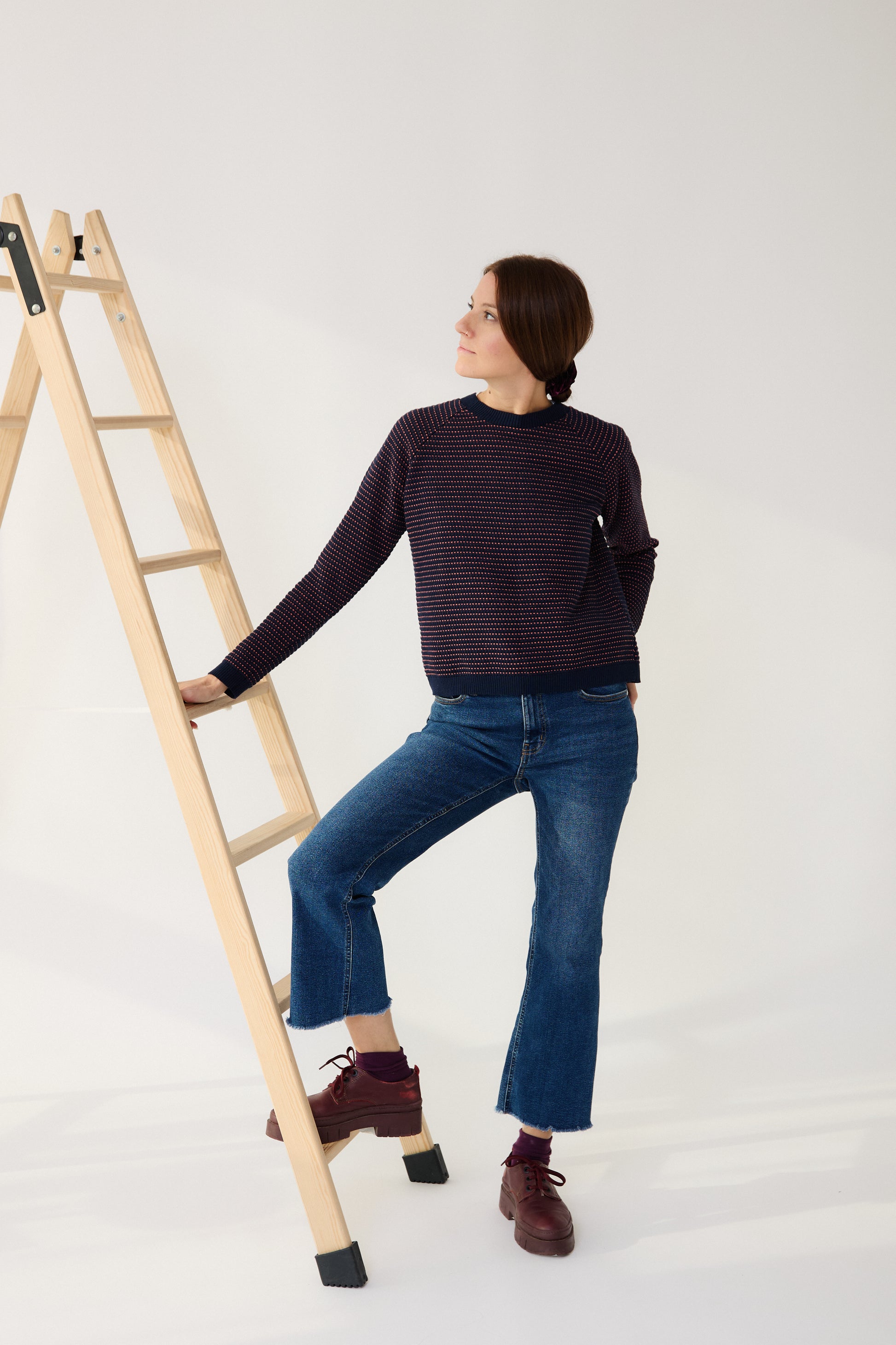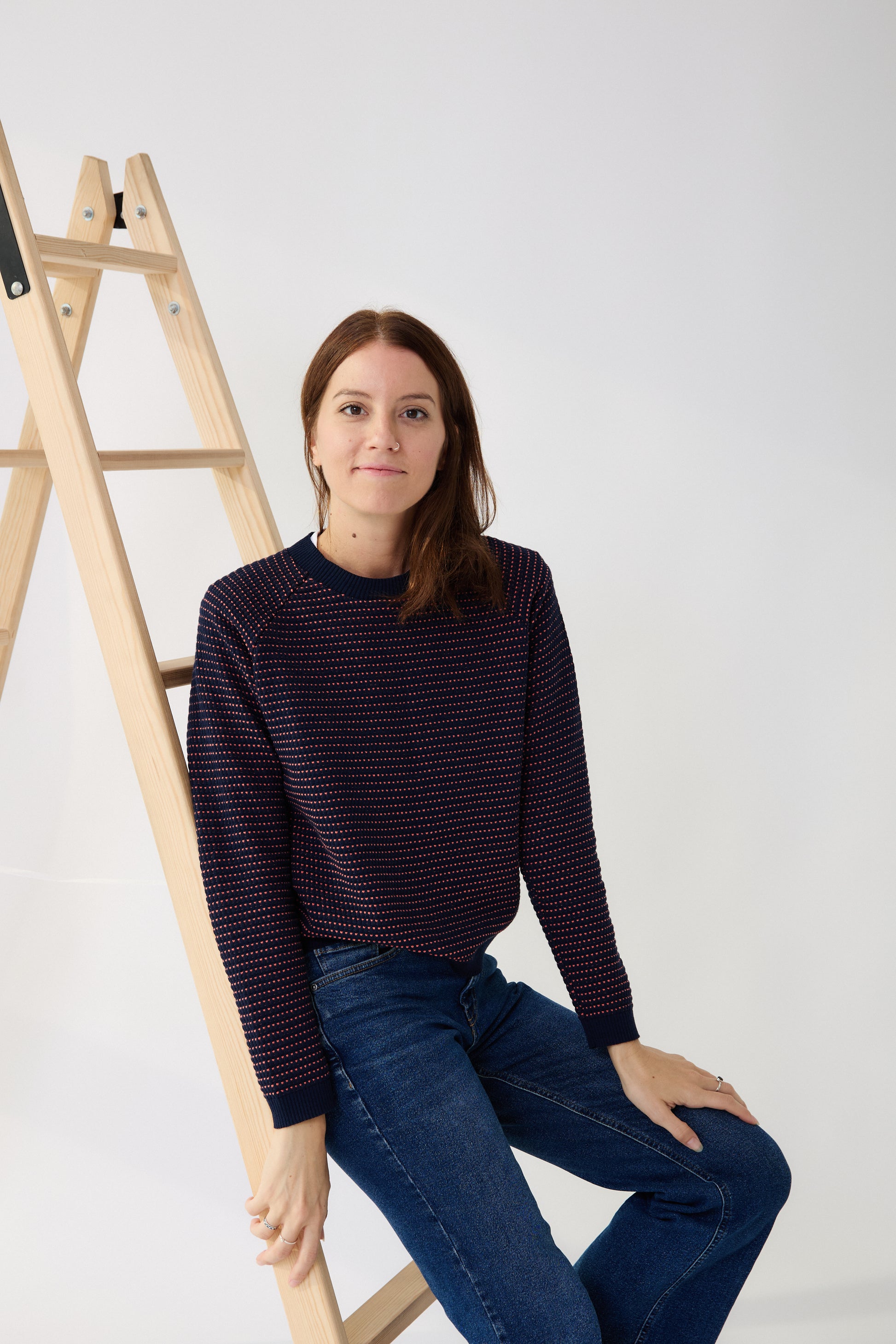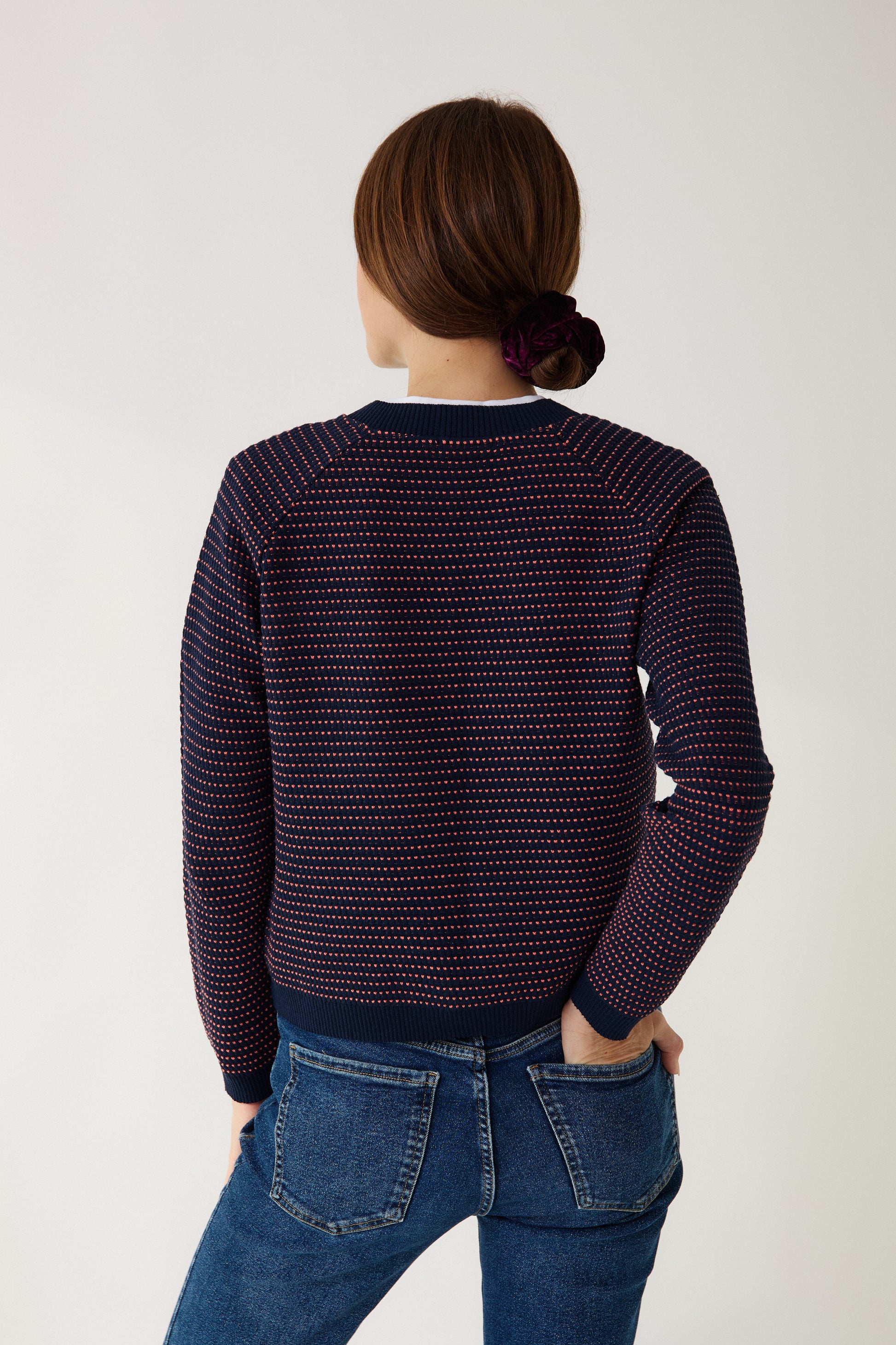 Jersei blau marí amb puntets salmó. De màniga ranglan i punt de links amb una mica de relleu i joc entre el blau marí i els puntets de color salmó. Còmode i molt agradable.