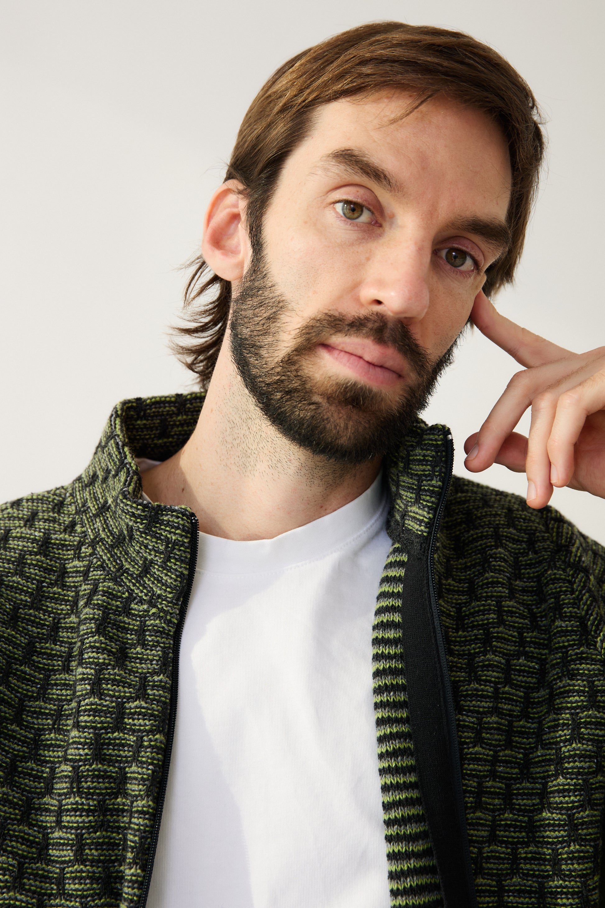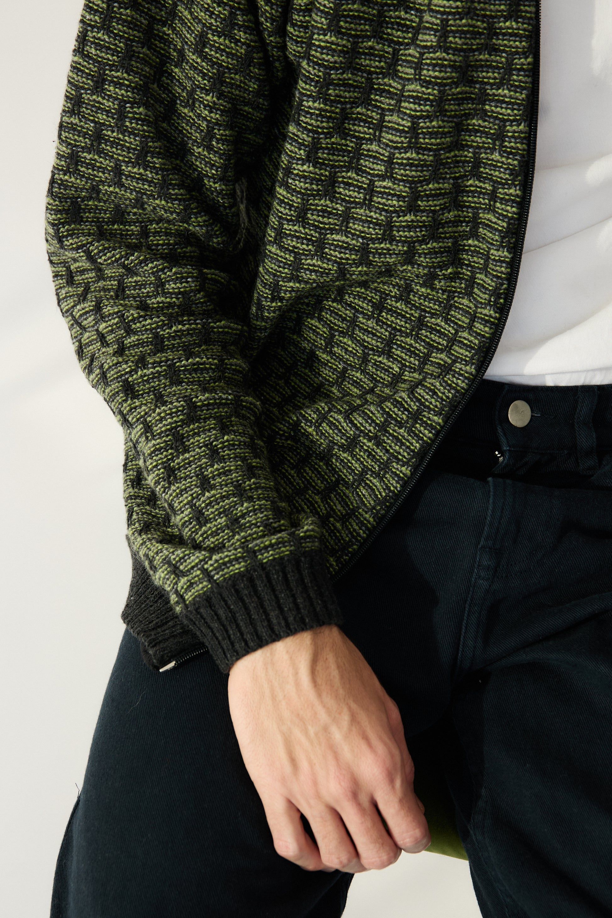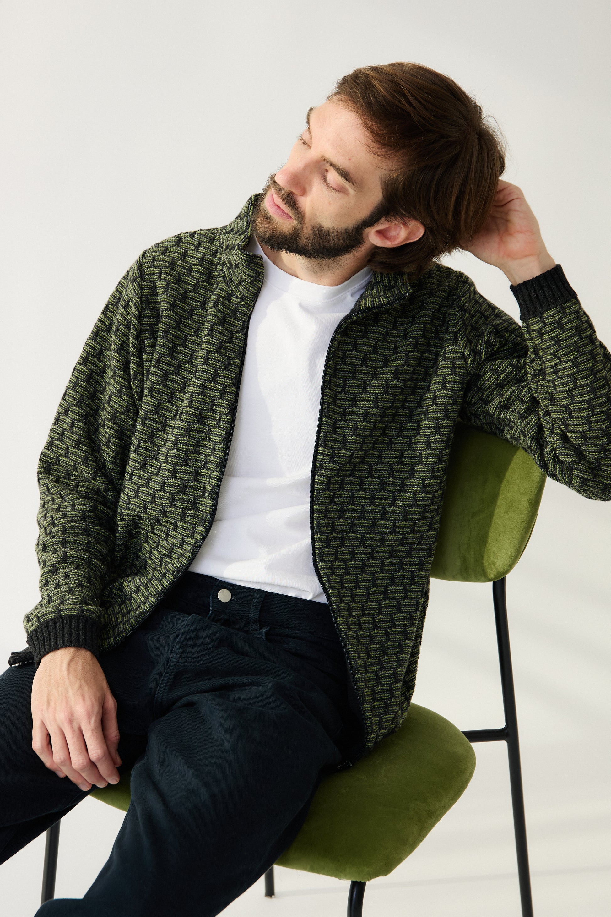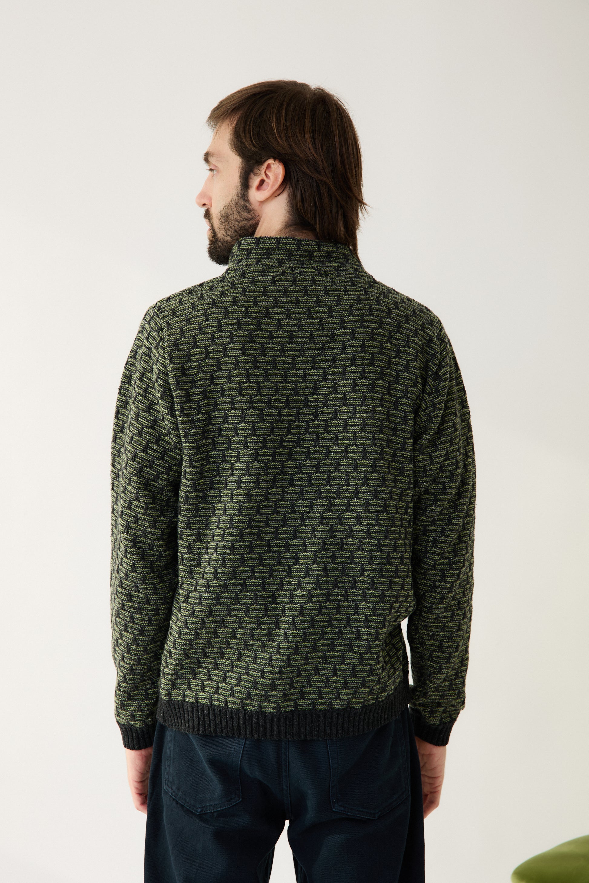 Jaqueta amb motius geomètrics de color verd caqui, verd festuc i gris mig. Amb coll cigne. Molt còmode i original.