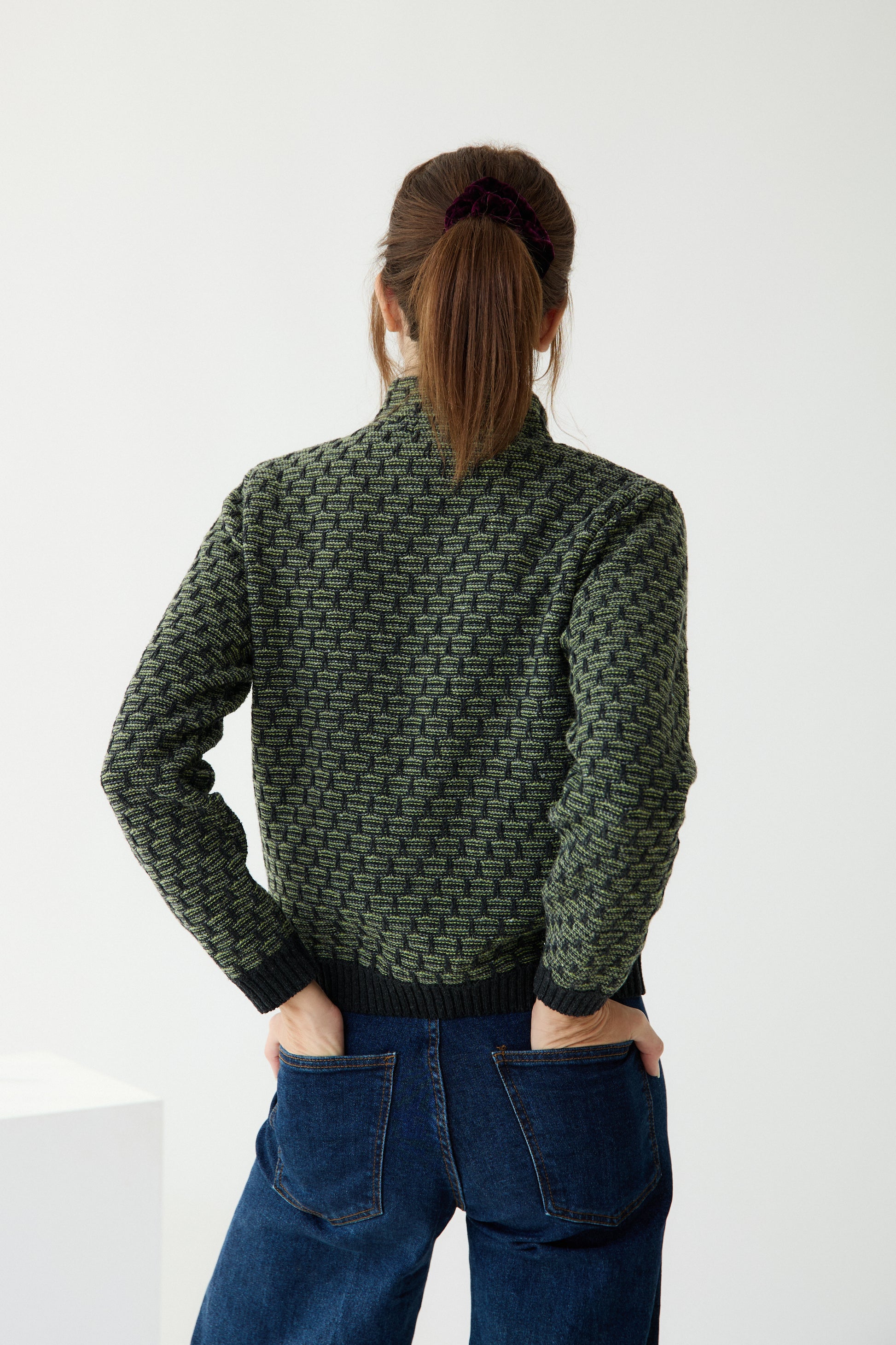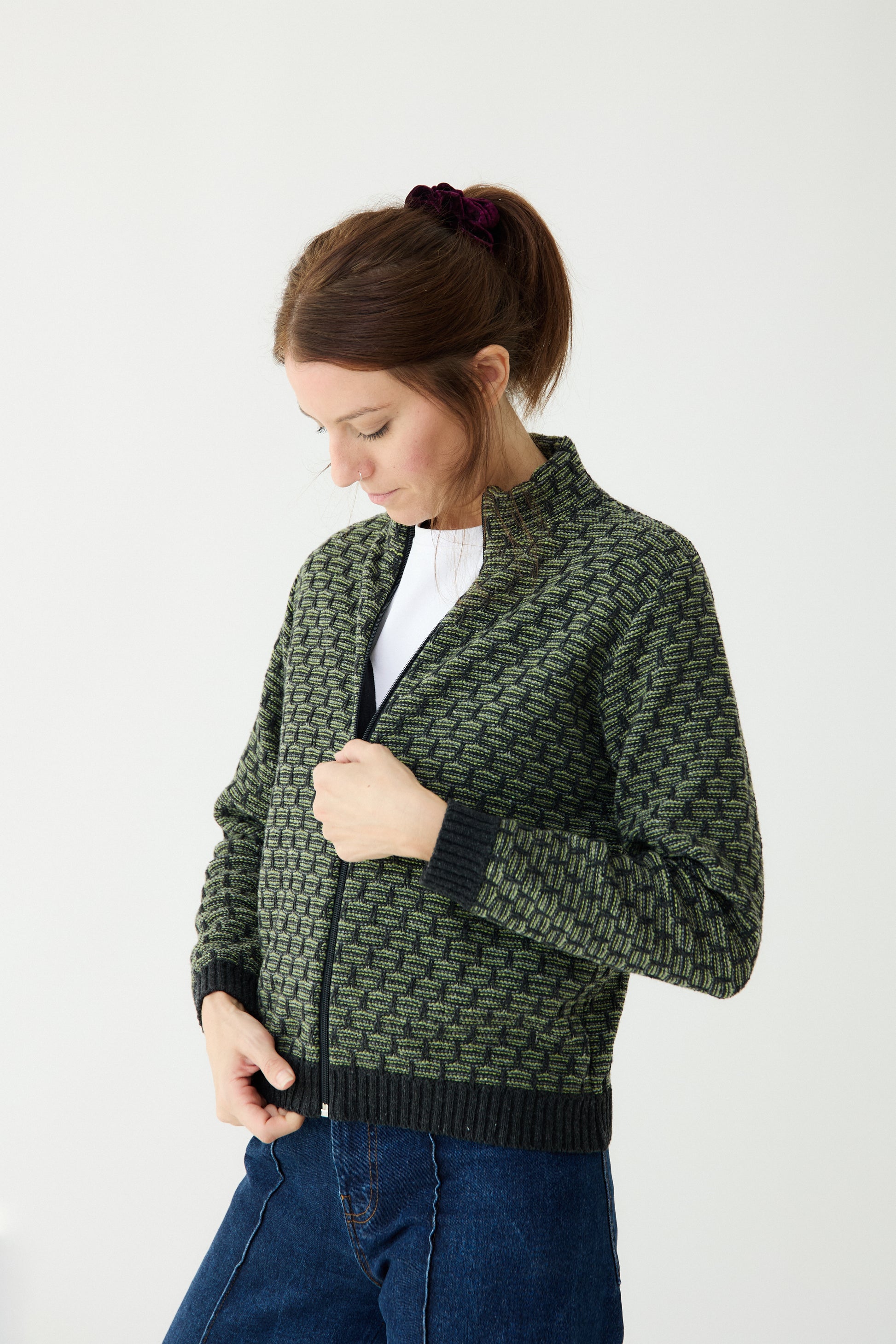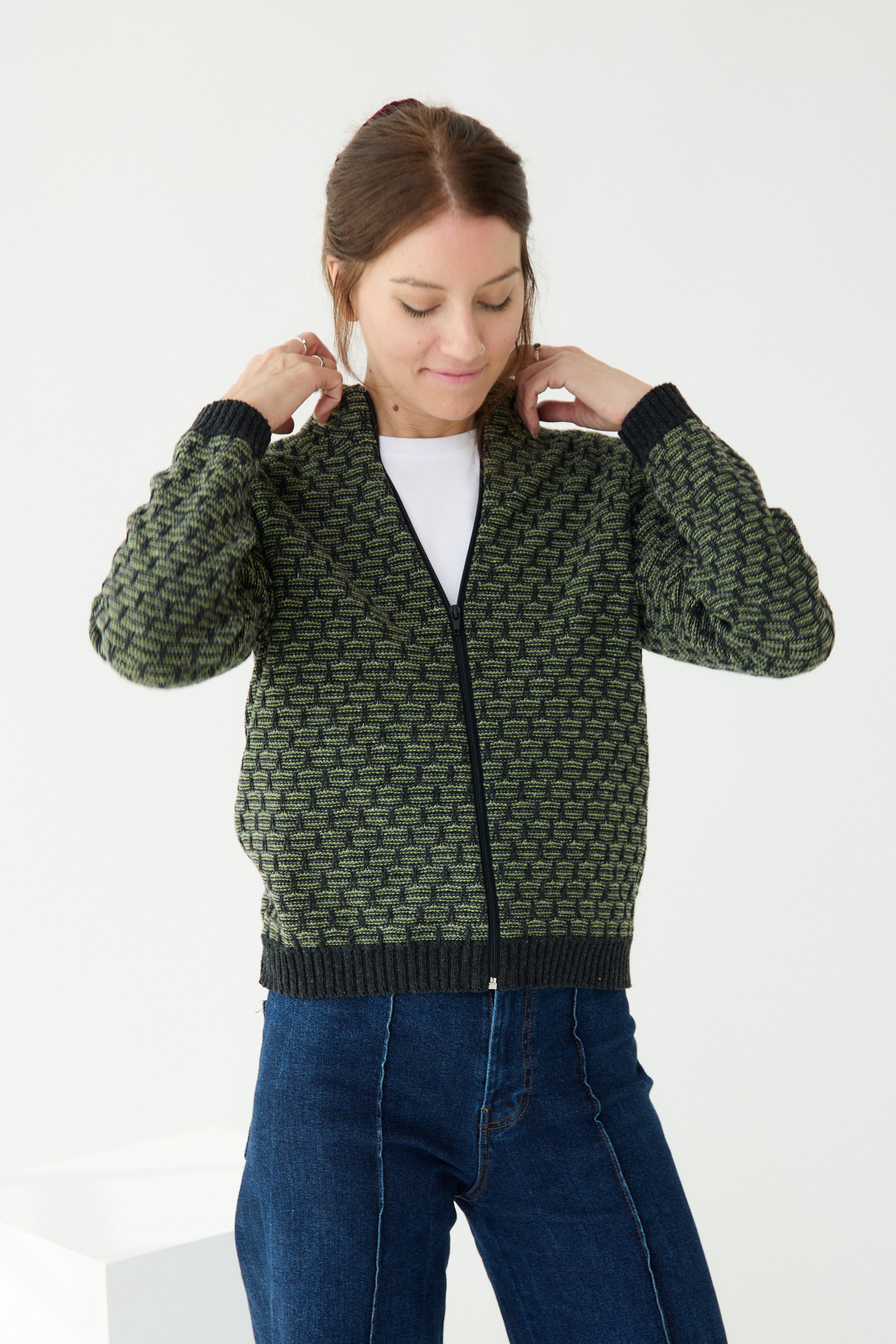 Jaqueta amb motius geomètrics de color verd caqui, verd festuc i gris mig. Amb coll cigne. Molt còmode i original.