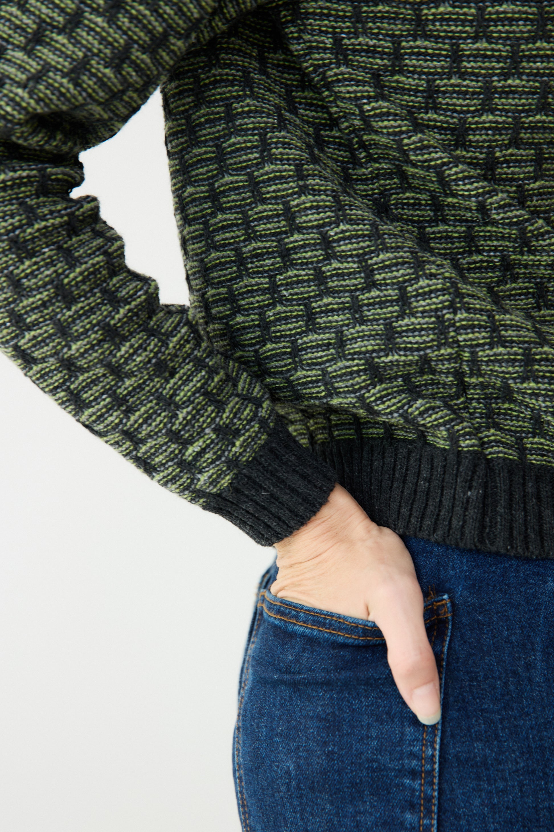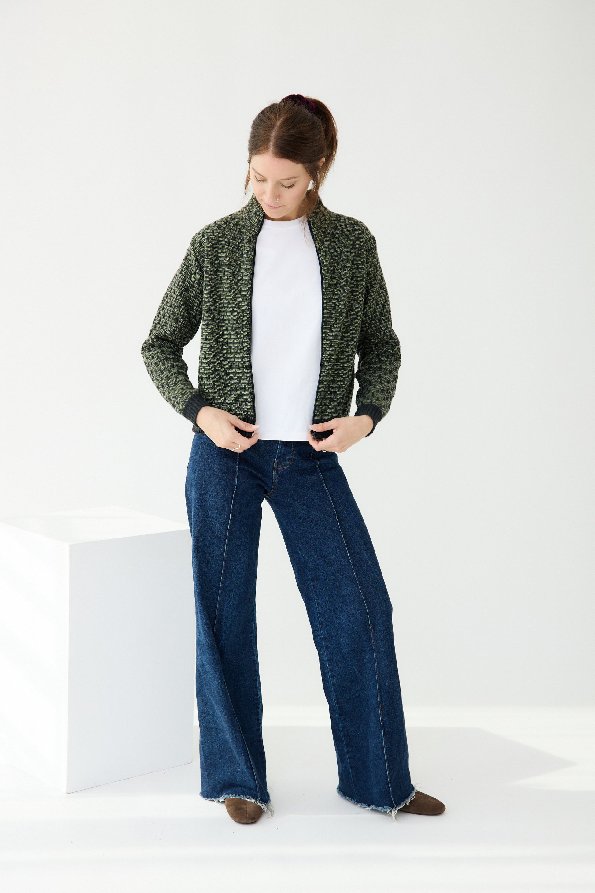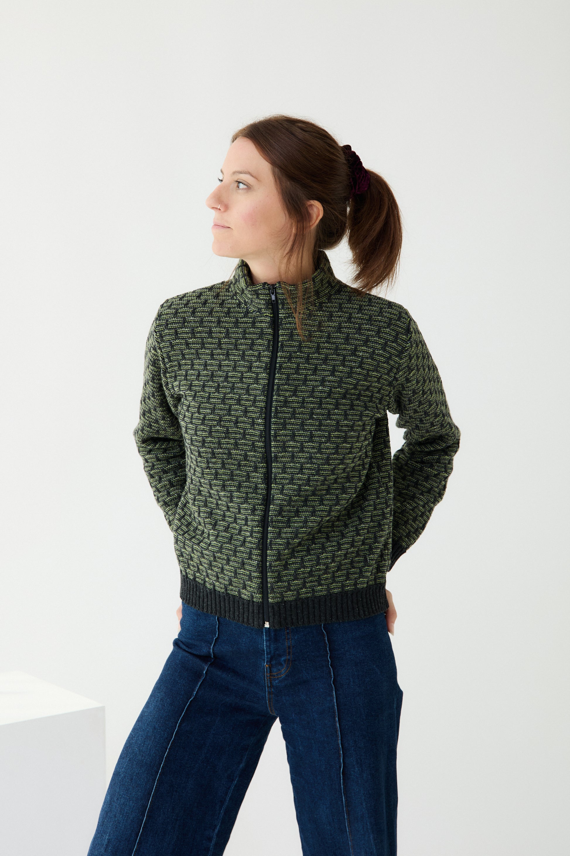 Jaqueta amb motius geomètrics de color verd caqui, verd festuc i gris mig. Amb coll cigne. Molt còmode i original.