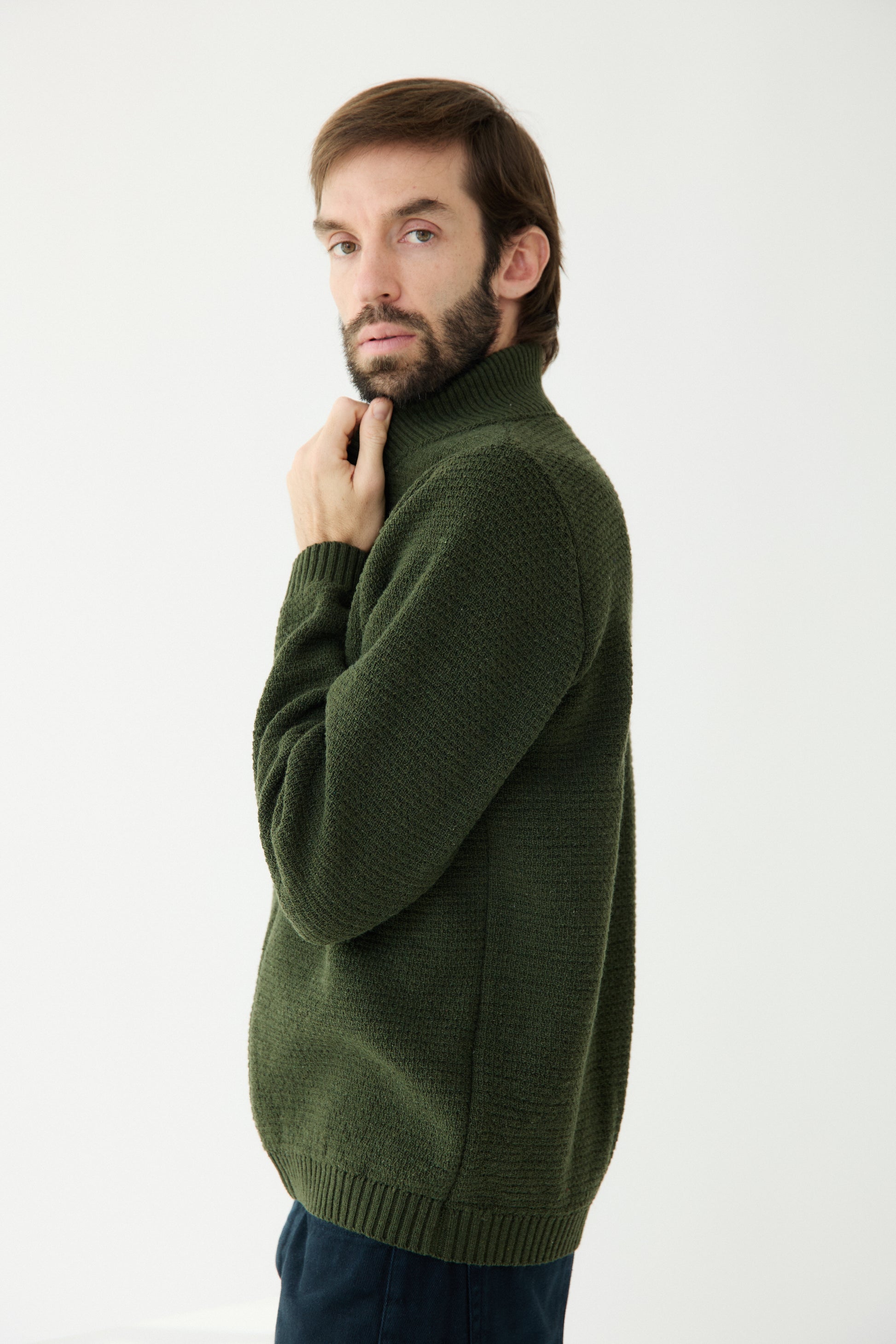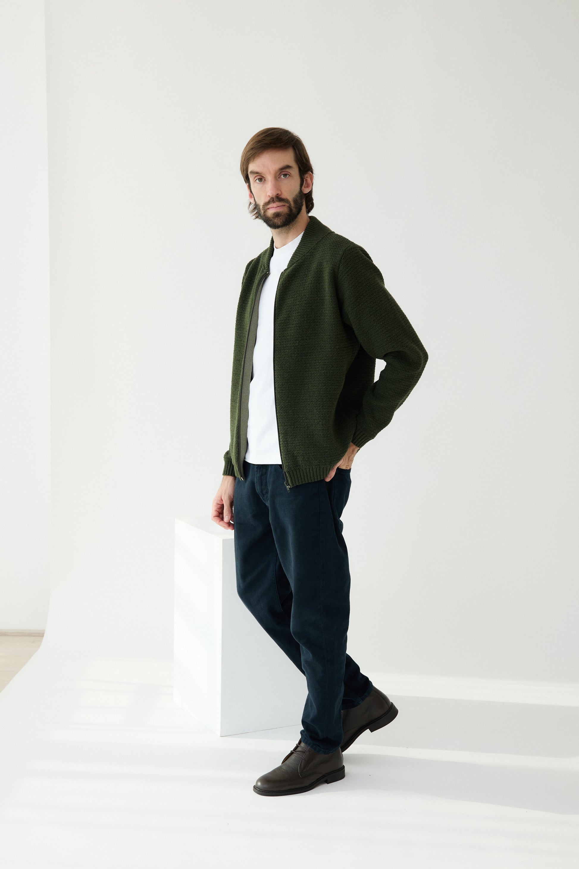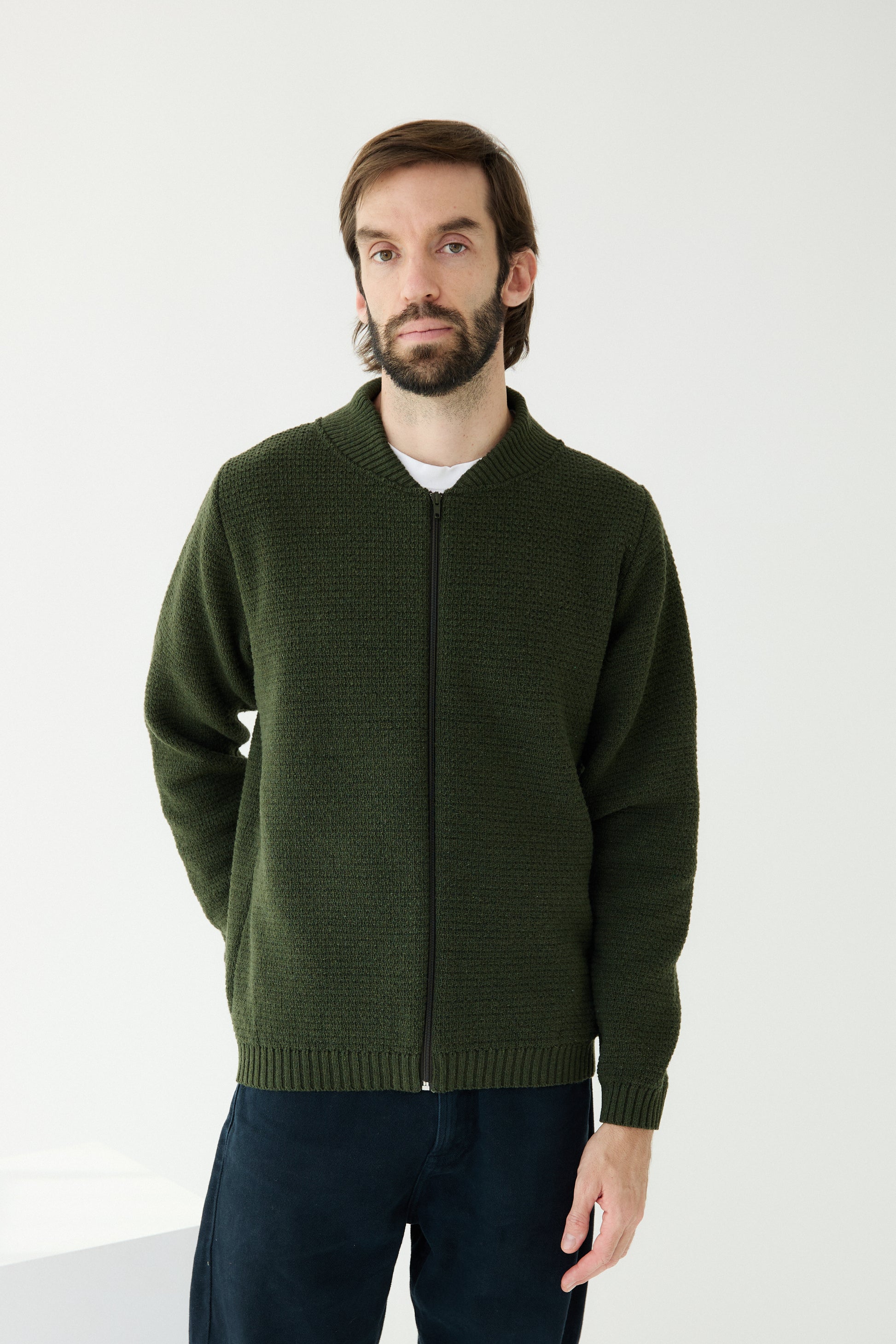 Jaqueta verd caqui de punt amb una mica de relleu i coll bomber.