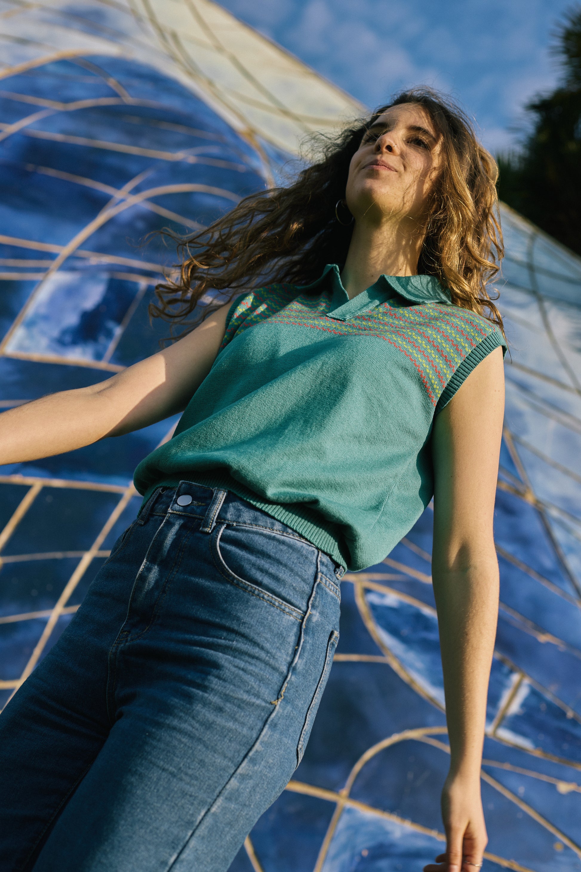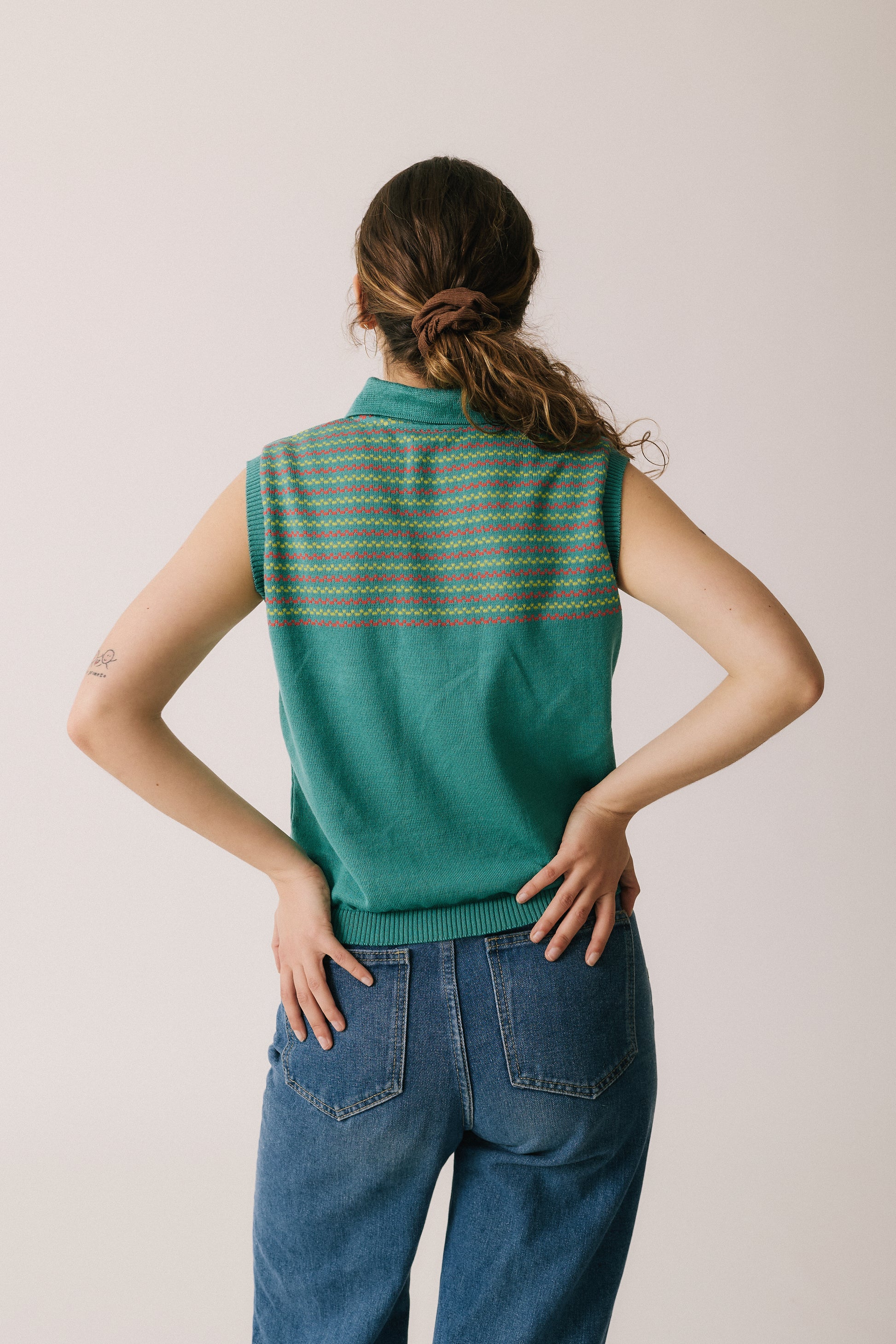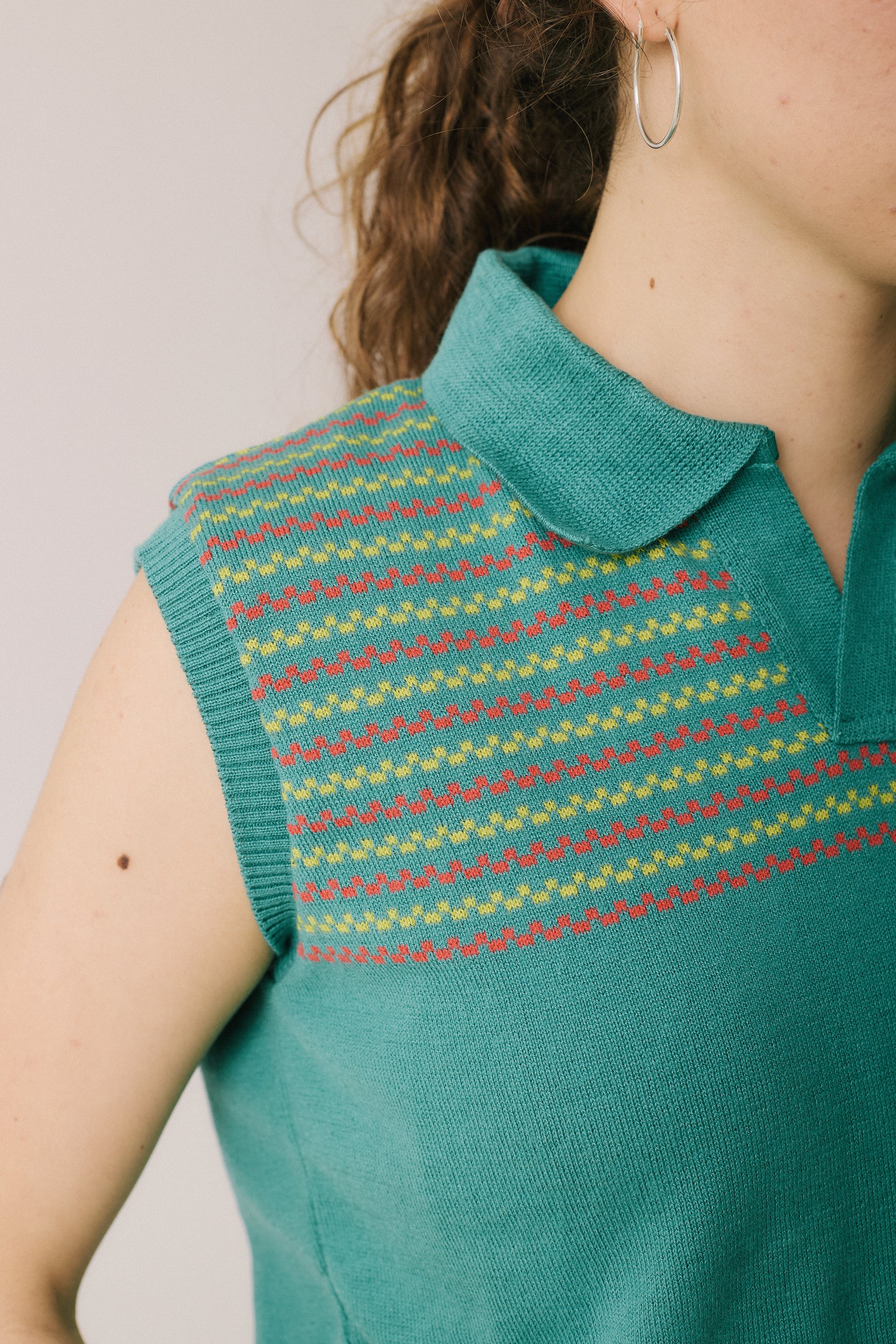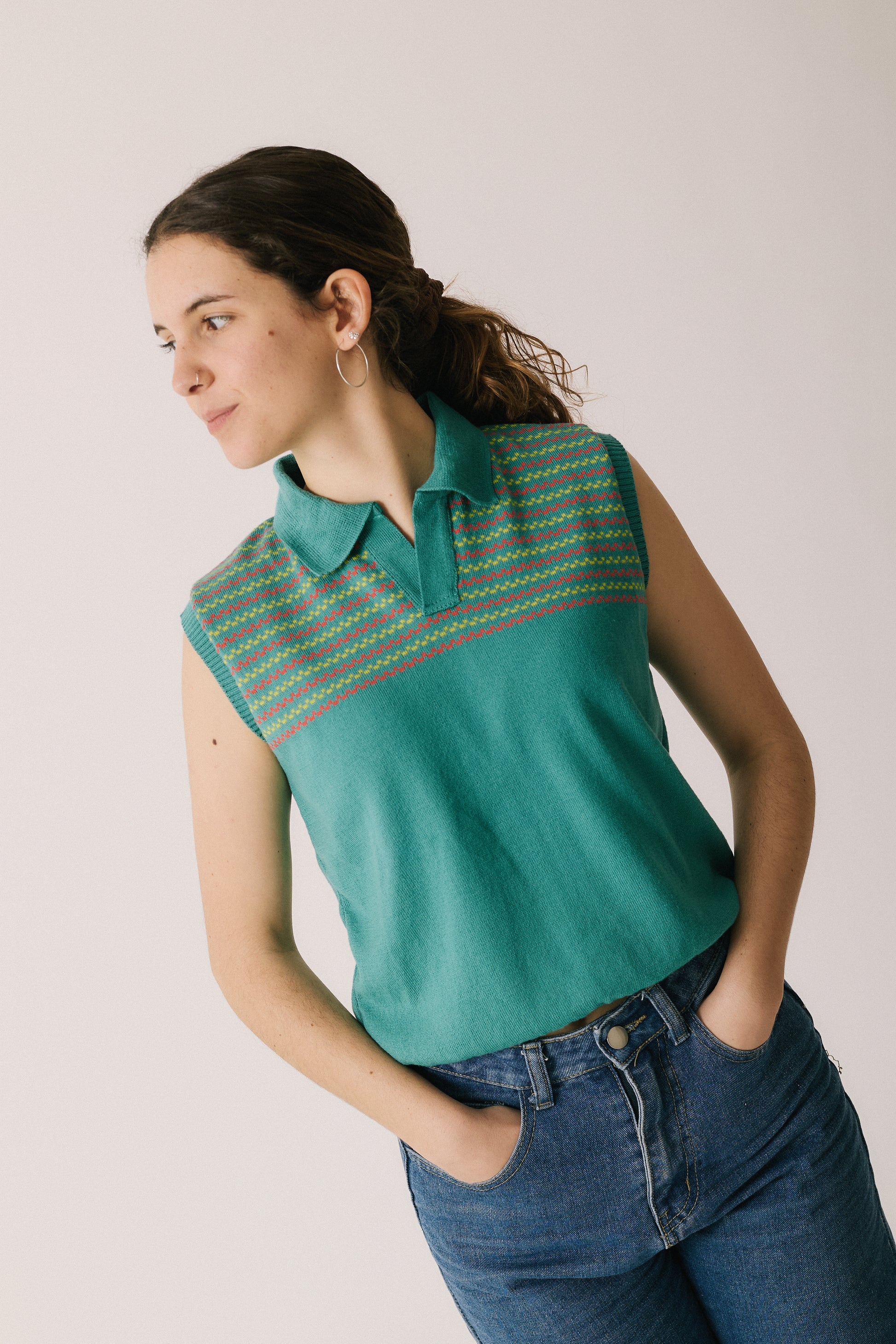 Polo sense mànigues en color turquesa. El detall de ratlles amb maonets corall i llima a la part superior aporta un punt de contrast i singularitat a la peça.