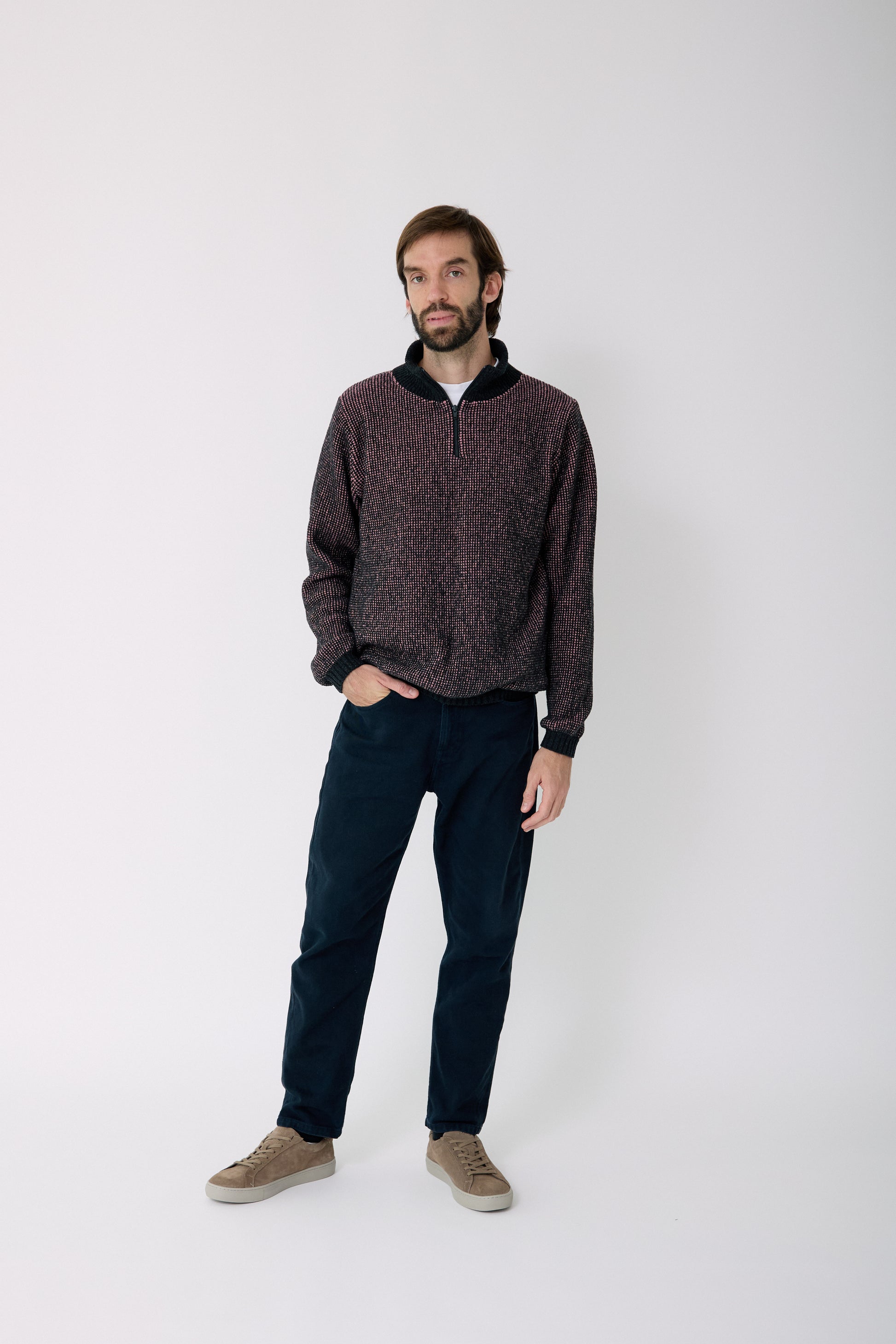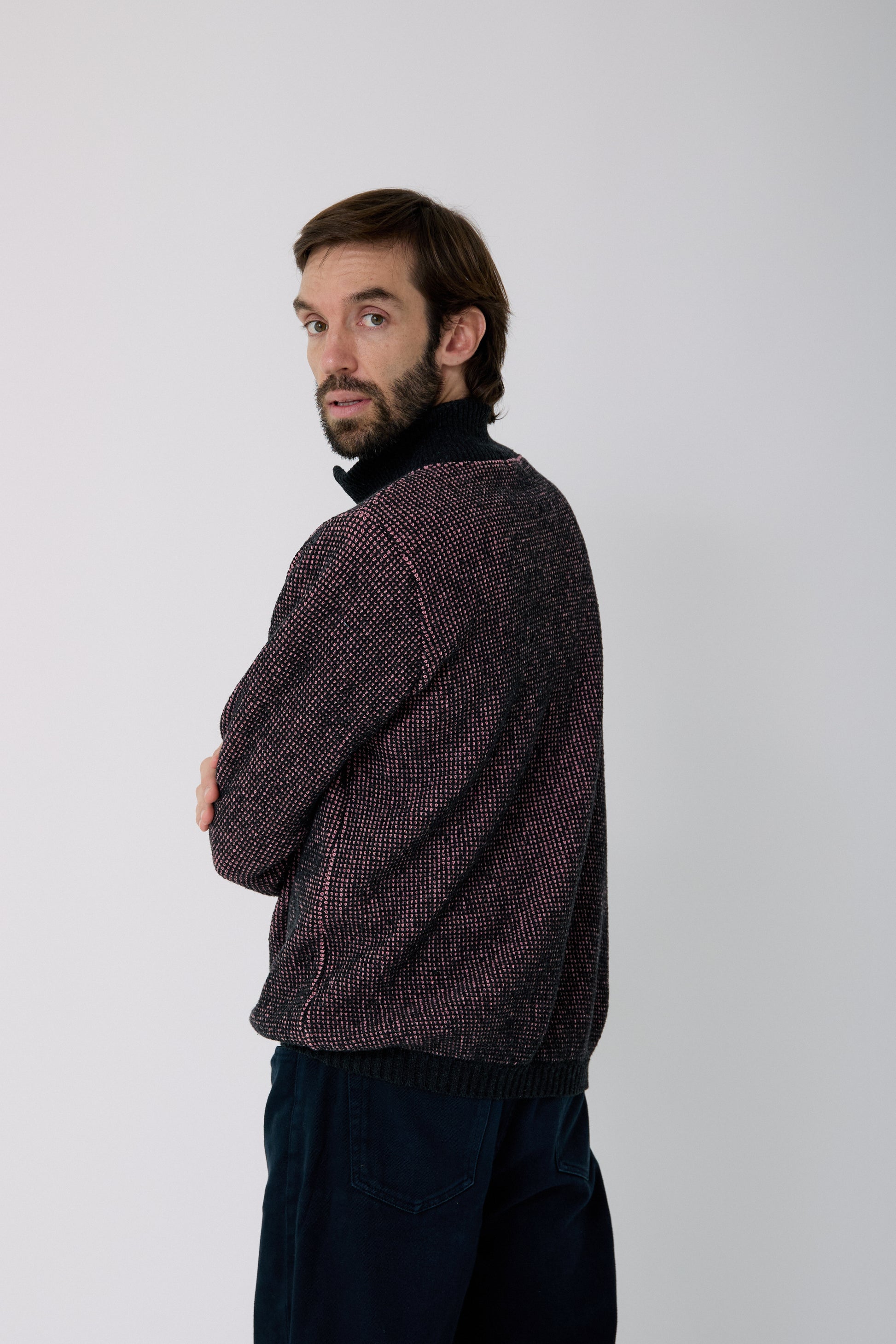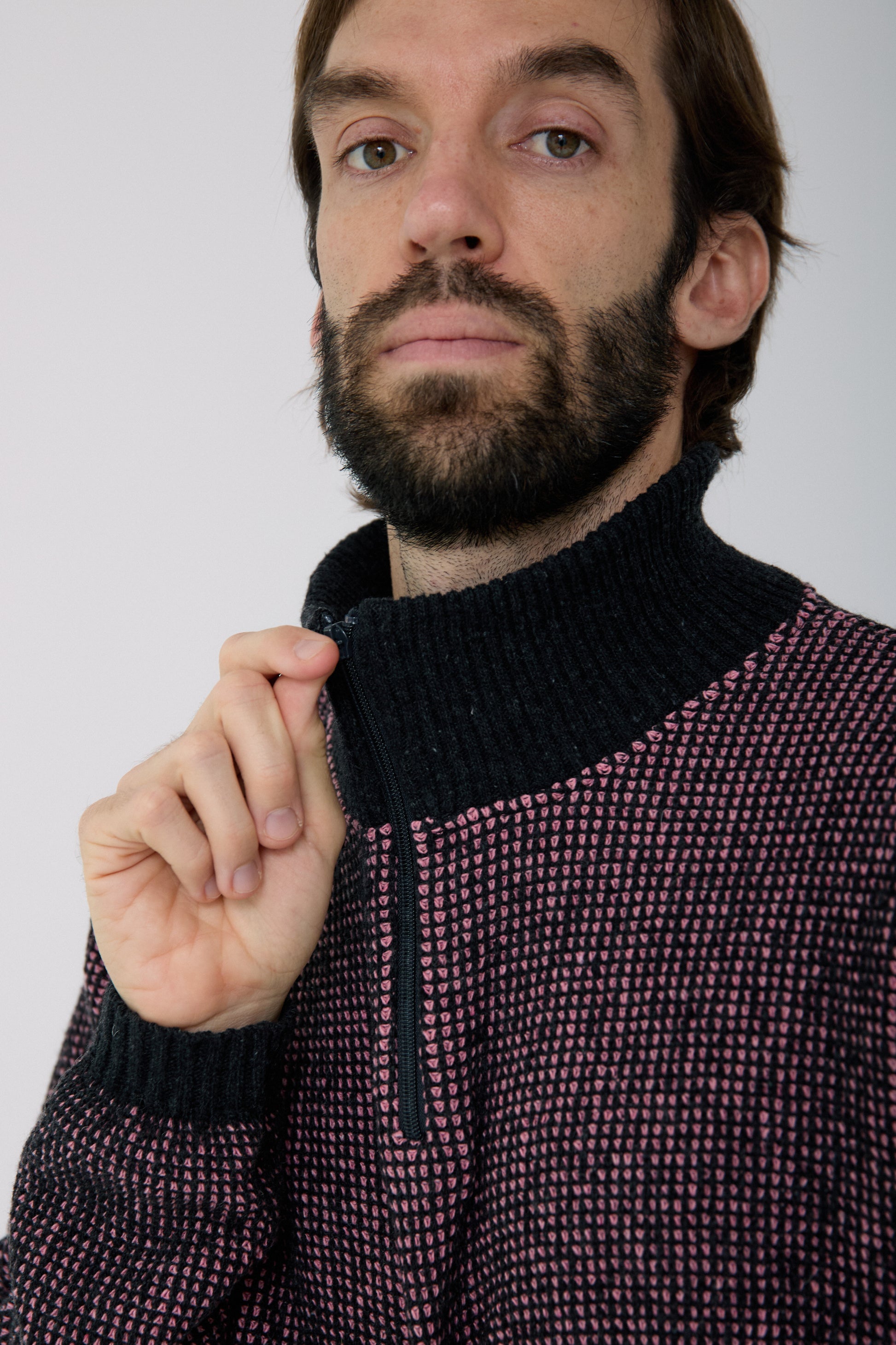 Jersei de mitja cremallera amb coll alt de canalé. Punt de malla de color rosa i gris marengo.