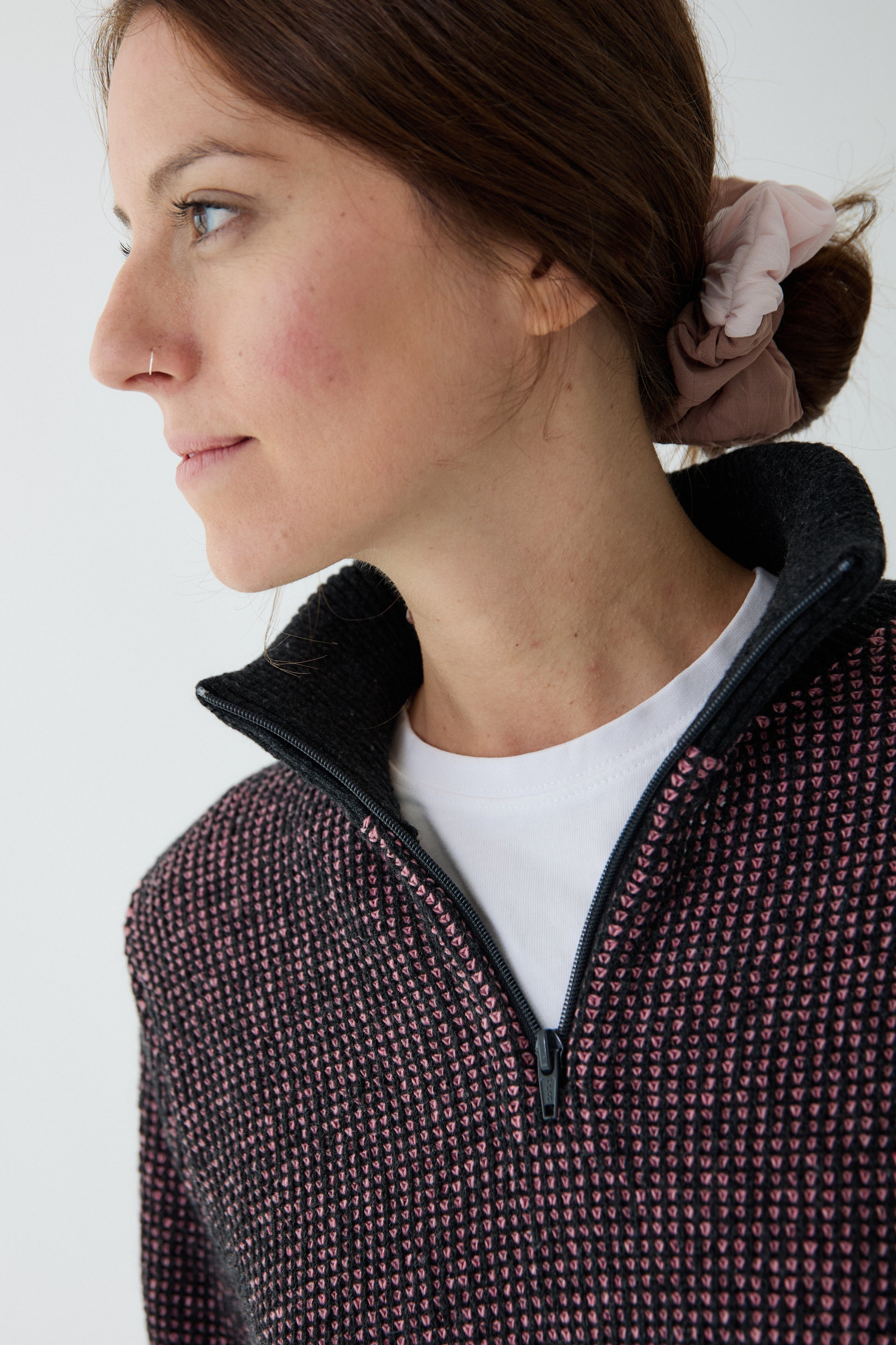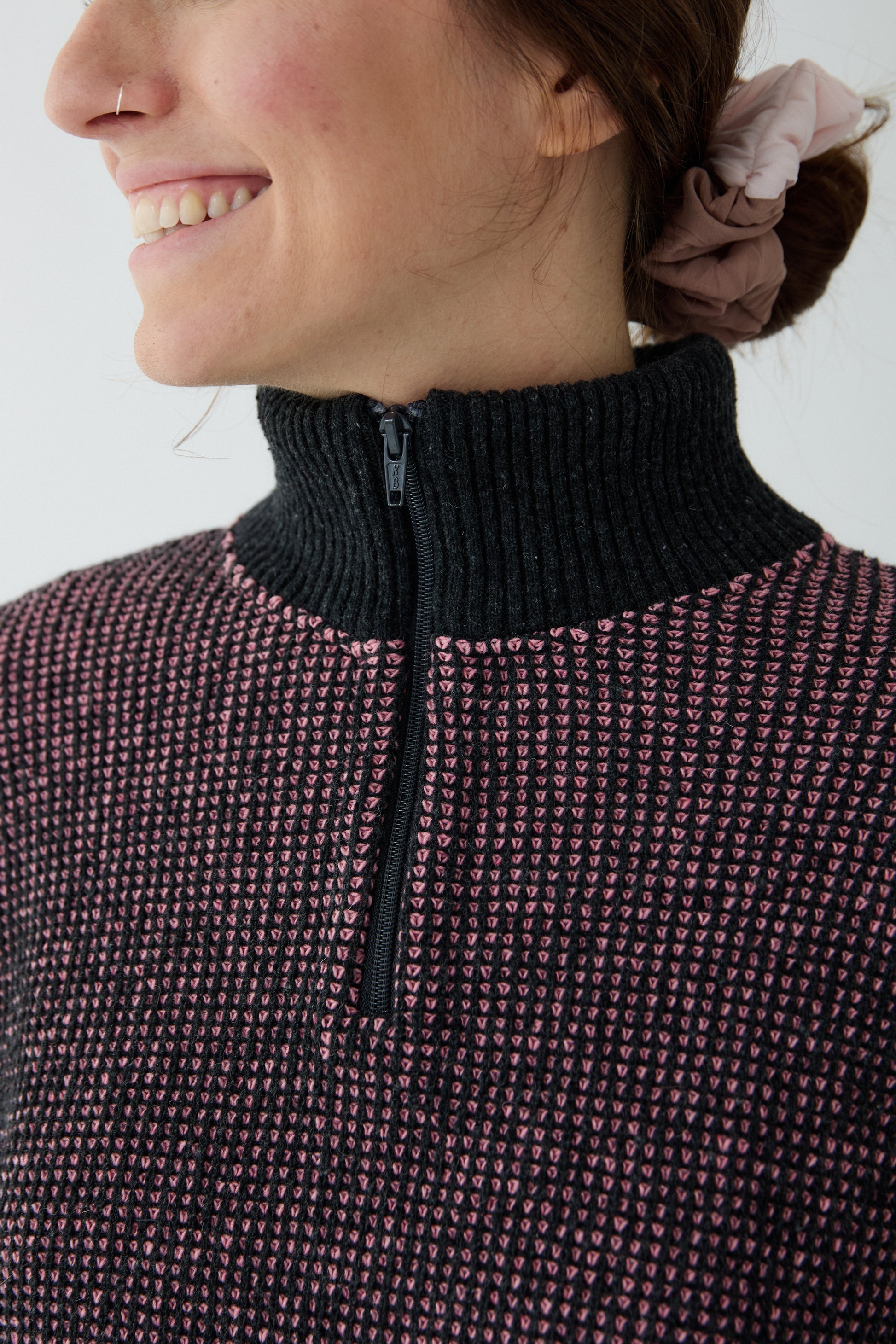 Jersei de mitja cremallera amb coll alt de canalé. Punt de malla de color rosa i marengo.